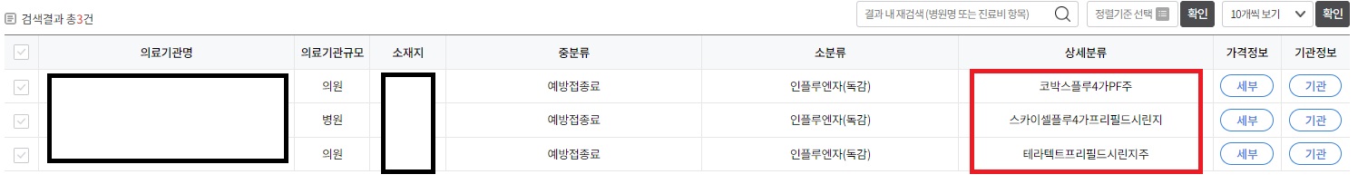 검색결과를 통해서 집 주변 의료기관과 예방접종이 가능한 약품명, 그리고 가격정보까지 확인이 가능합니다.