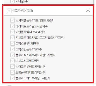아래로 조금만 스크롤하시면 "인플루엔자"가 나와요. 모두 선택하신 후에, 파란색 선택항목 검색을 클릭하시면 됩니다.