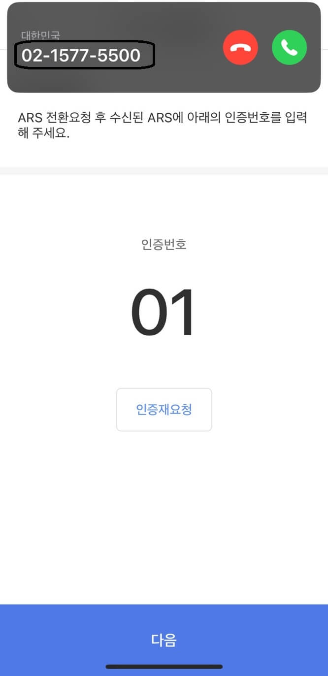 ARS인증을 하면 02-1577-5500으로 전화가 옵니다. 그럼 화면에서 확인된 인증번호 01을 키패드에 누르시면 됩니다.