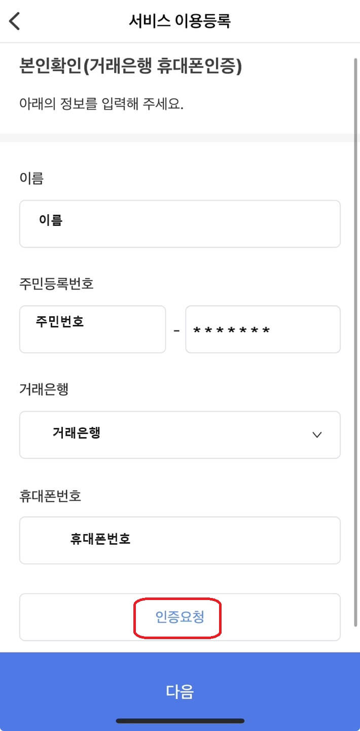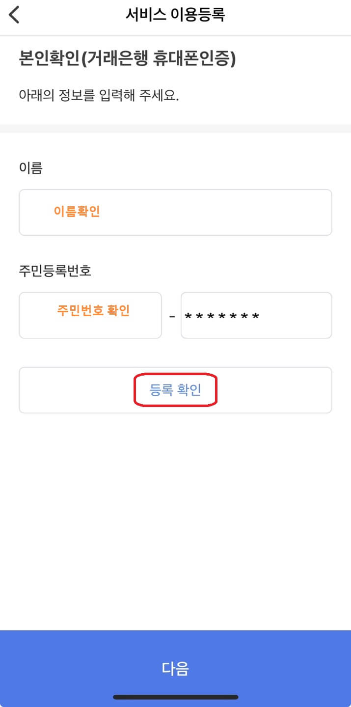 서비스 이용등록을 확인하시고요. 본인확인을 위한 아래 정보를 입력합니다.