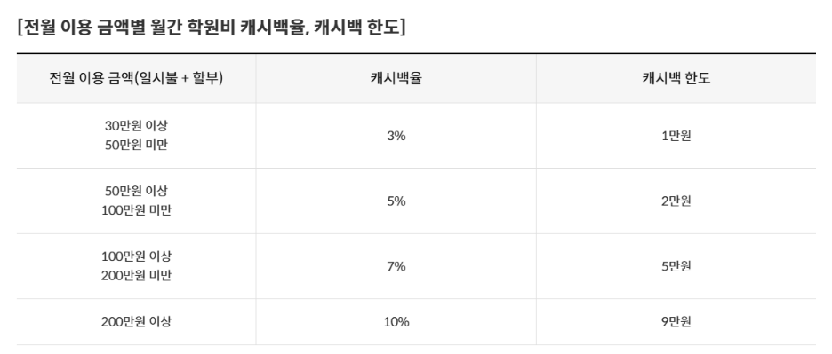 월 20만원 이상 학원비 결제 건수별 추가로 4건까지 결제 시에는 5천 원, 5건 이상 결제 시에는 1만 원이 캐시백 된다고 합니다.