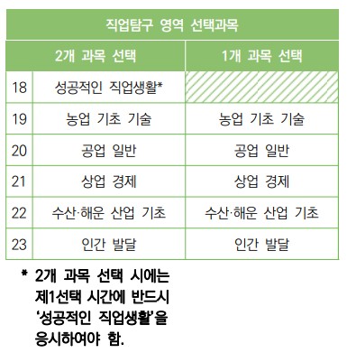 직업탐구 영역의 경우에는 2개과목 선택 시에는 반드시 '성공적인 직업생활'을 공통 선택한 후 다음 5개 과목 중 1개를 선택해야 합니다.