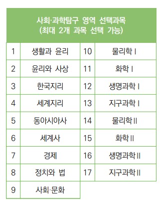 탐구영역은 사회탐구와 과학탐구로 나눠지며, 총 17개 과목에서 최대 2과목을 선택할 수 있으며, 과목 순서에 따라 응시해야 합니다.