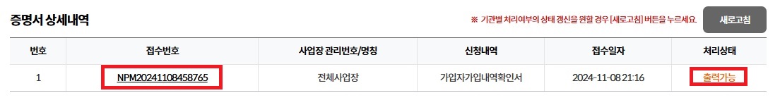 혹시 나중에라도 출력을 하실 분은 접수번호를 클릭하면 출력화면으로 이동하니 참고하시기 바랍니다.